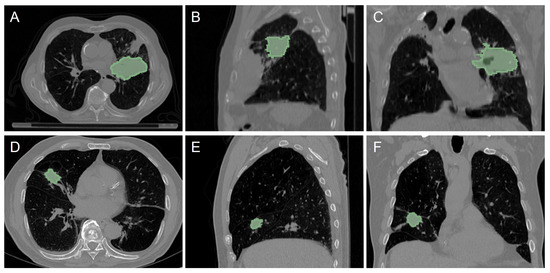Examples of CT images and tumor volumes (marked with a green area) from LUNG1 (upper row) and LUNG2 (lower row) datasets: axial (A,D), sagittal (B,E), and coronal (C,F) views.