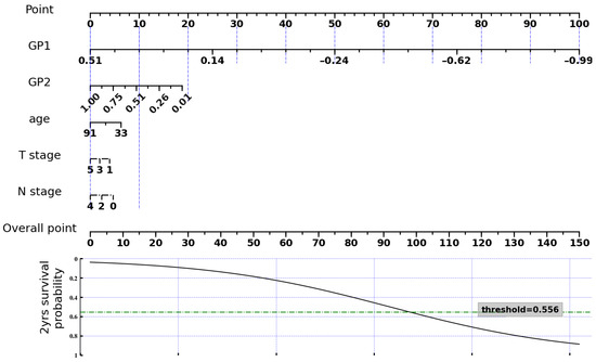 A nomogram for predicting two-year survival using the GP features from the internal validation and clinical and demographic information.