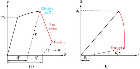 The plastic model with damage variable , known as the Lemaitre’s damage model, is considered in this work [51] for describing ductile and brittle fracture behaviors. In this model, the damage variable represents the total fracture of materials and represents intact materials. Moreover, the relationship between effective stress and real stress in the theory of continuum damage mechanics (CDM) is given by [51]: