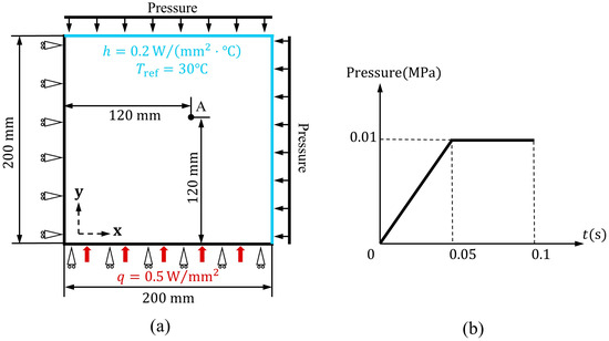 In order to validate the accuracy of the proposed PD model in simulating thermodynamic response, a plate under thermal shock load is considered. The geometry and loading conditions are shown in Figure 3. The material properties are given in Table 1. The horizon is set to be , and is set to be . The initial temperature of the structure is set to be . A heat flux is applied on the structure bottom. The convective heat transfer boundary is applied on the top and right surfaces with coefficient and reference temperature . The time increment is chosen as .