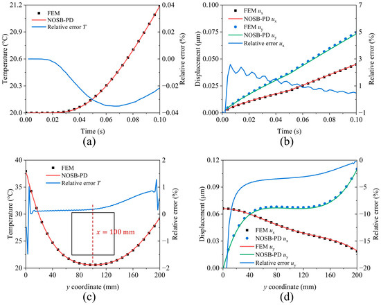 Results obtained by the FEM and the proposed NOSB-PD model: (a) temperature and (b) displacement histories of point A, (c) temperature and (d) displacement distributions along direction at .