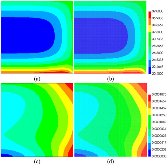 Contour plots of plate at : (a) temperature and (c) displacement obtained by the FEM, (b) temperature and (d) displacement obtained by the proposed model.