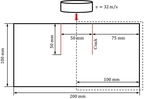 The Kalthoff–Winkler test, as a classic benchmark problem for studying dynamic fracture and peridynamics simulation results [44,58], is considered here to verify the ability of the proposed model and the fracture criterion. It can be observed that a brittle fracture mode occurs with impact speed of , and the crack propagates around with respect to the pre-existing cracks during the test. The specimen geometry and loading boundary are shown in Figure 6.