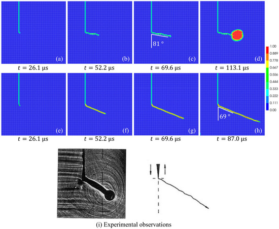 Comparisons of crack propagation obtained by (a–d) the bond stretch criterion, (e–h) the proposed criterion, and (i) the experimental observations [59].