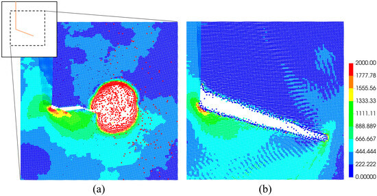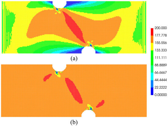 Figure 8 further shows contour plots of von Mises stress obtained by the two criteria, which demonstrates why the application of the bond stretch criterion in the NOSB-PD framework to simulate the fracture problem often fails. As shown in Figure 8, the stress level is increasing at the bottom of the pre-existing crack and leads to crack initiation. However, using the bond to determine a crack cannot guarantee that the deformation at the crack tip will not produce the numerical oscillation, which leads to chaotic displacement and extreme stress [see Figure 8a]. Instead, using the proposed criterion gives a more stable displacement field and low effect of stress concentration [see Figure 8b].
