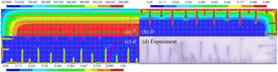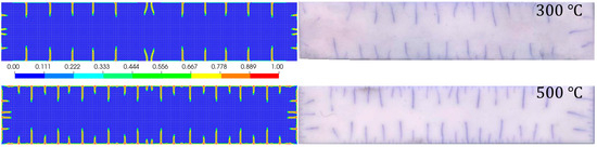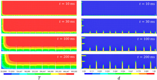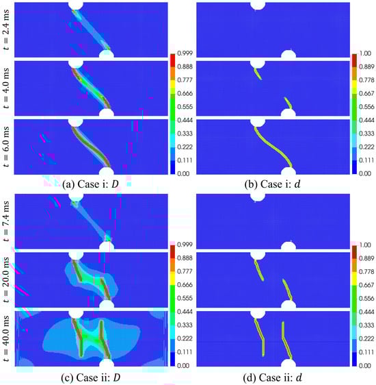 Figure 11 shows the crack propagation process of two cases, including contour plots of damage and fracture level . For case i, the crack initiates at the two notches and gradually expands along the oblique direction of the sample with the loading of uniaxial tensile displacement. For case ii, the crack also appears at both notches. However, the cracks extend obliquely and then laterally to the other side of the notch. In addition, the damage distribution is also different in the two cases. In case i, the damage is mainly distributed within the area of the line connecting the two notches. In case ii, the damage distribution is similar to case i at the initial fracture moment. With the crack propagation, most of the areas of the specimen are damaged, which leads to a different crack form with respect to case i. These results demonstrate that the proposed PD model has the ability to simulate the ductile fracture, and the temperature effect cannot be neglected when the fracture analyses are performed on the structure.