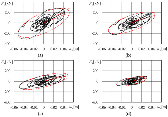 where α is the angle of inclination of the brace with respect to the horizontal line, lb is the length of the brace, Ab is the area of the cross-section of the brace, and E is Young’s modulus of steel. Once the equivalent stiffness keq is determined by Equation (29), the VED–brace subassembly is represented in the numerical model by means of a fictitious brace with cross-sectional area Aeq equal to