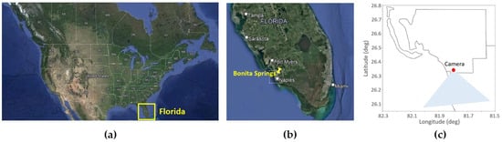 (a) Location of Florida on a map of the United States; (b) a map of Southwest Florida showing the location of Bonita Springs (26.3° N and 81.8° W). (c) Zoomed-in view of the area indicated by the white dot box in (b) showing the location of a camera (26.3° N and 81.8° W) with the red dot and its respective field of view represented by the light blue triangle.