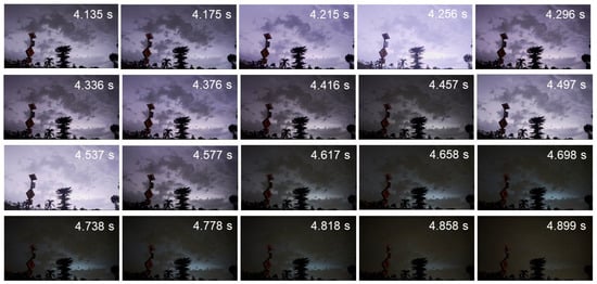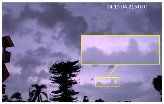 A lightning event was recorded on 17 April 2023 from 04:13:03.000 UTC to 04:13:05.800 UTC. The camera, located at the coordinates 26.3468° N and 81.7996° W, operated at a frame rate of 24.88 fps, resulting in a frame-to-frame interval of 40.19 ms. A total of 69 frames are recorded, corresponding to a duration of 2.77 s. The time shown in each frame indicates the second within 04:13 UTC (e.g., 4.135 s in the first frame in Figure 2 corresponds to 04:13:04.135 UTC). A very weak luminosity appears on the right side of the image at 2.969 s, and the luminosity starts to brighten at 3.090 s. The luminosity fluctuates between dim and bright repeatedly, with the brighter luminosity occurring from 3.854 s to 4.256 s. Figure 2 illustrates the time from 4.135 s to 4.899 s, corresponding to 04:13:04.135 UTC to 04:13:04.899 UTC, which includes some of the brighter luminosity and different colored luminosities. Among all the frames, only one frame at 4.215 s captures a lightning discharge propagating horizontally, as shown in Figure 2, occurring at 04:13:04.215 UTC. The zoomed-in frame of the visible discharge is presented in Figure 3. As shown in Figure 2, the color of the luminosity changes from pinkish in the frame at 4.577 s to greenish in the next frame at 4.617 s, and then to blueish in the following frames from 4.658 s. Figure 4 displays the GLM lightning events from 04:13:03.500 UTC to 04:13:05.500 UTC. The colored dots represent the lightning locations, with color ranging from red to violet, within a 0.25 s time window. The grayscale illustrates a cloud-top height detected by the longwave IR band (13) of ABI. The first detection during the timeframe was 04:13:03.908 UTC, shown as a red dot in Figure 4. The last discharge in this timeframe occurred at 04:13:05.459 UTC. A cluster of red, orange, and yellow dots is displayed in the lower left of the map, within the coordinates of 25.97° N–26.07° N and 81.93° W–81.81° W during the time interval from 3.5 s to 4.5 s, as shown in Figure 4, and these are assumed to be a single flash [8]. Moreover, the cloud density in the area of the clusters is much lower than in the area above latitude 26.10° N. The average distance of the flash from the camera location is determined to be 42.5 km, using an average distance of the red, orange, and yellow dots reported by GLM. The time of the discharge, shown in Figure 3, corresponds to the orange dot time window, which spans from 04:13:04.000 UTC to 04:13:04.250 UTC within a 250 ms time window, as displayed in Figure 4. Since one frame is about 40 ms, the duration of the visible discharge could occur within 40 ms. The adjacent frames, both before and after the discharge, exhibited significant brightness, indicating the occurrence of a discharge corresponding to the dots. The discharge could be classified as cloud-to-air, cloud-to-cloud, or spider lightning. An interesting aspect of this event, displayed in Figure 4, is the red, orange, yellow, light blue, and green dots occurring from 3.50 s to 4.75 s. These flashes are observed over the ocean, and the first flash on land is represented by the light blue dot occurring at 4.999 s, almost simultaneous with the time window of the blue dots. Moreover, less dense clouds are observed in the region where the red to orange dots are detected, while dense clouds are distributed in the region of the light blue to blue dots.