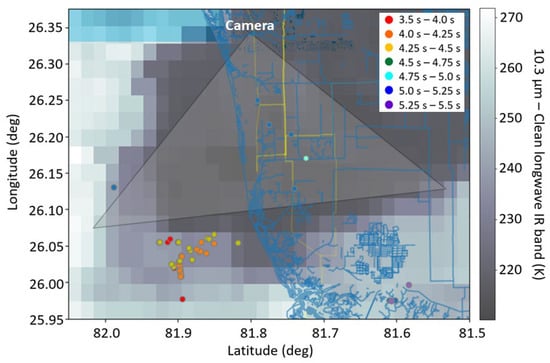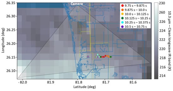 Figure 12 shows the distribution of the cluster of green and light blue dots occurring very far from the camera at the coordinates of 25.1° N–26.2° N and 81.5° W–82.6° W from 4.60 s to 4.94 s, with a duration of 0.330 s. This duration corresponds to the total time of the last eight frames showing the green- and blue-colored luminosity, as represented in Figure 2. As illustrated in Figure 2, the frames display a bluish bright sky during the timeframe of this cluster, with the brightness located on the right side of the image, likely corresponding to the cluster’s position in the camera’s field of view. If so, the average distance of the cluster of those green and light blue dots is estimated at 153 km from the camera, and the height of the discharge is estimated to be 2.28 km above sea level. When the cluster of green and light blue dots occurred, the conditions of storm, precipitation, and cloud top in the area were similar to those during the timeframe corresponding to the red, orange, and yellow dots (Figure A1a–g in Appendix B; Figure A2a–g in Appendix B).