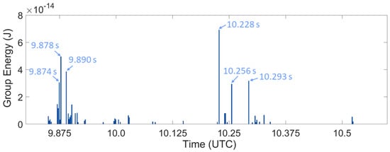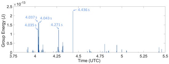 Group energy of lightning discharges reported by GLM from 04:13:03.750 UTC to 04:13:05.500 UTC. The time shown along the horizontal axis indicates the seconds within 04:13 UTC. Given the absence of any detected event from 3.50 s to 3.75 s, the initial time of this plot is set to 3.75 s. Discharges with higher group energy occurred between 04:13:04.0 UTC and 04:13:04.5 UTC, as indicated by the presence of orange and yellow dots in the GLM plot in Figure 4. The highest energy was detected at 04:13:04.4366 s.