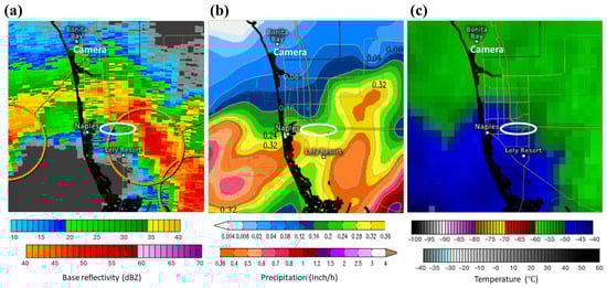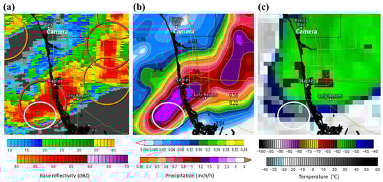 Weather maps reported by weather.us [47] corresponding to the GLM map in Figure 4. The selected times of the weather maps are the closest to the timeframe of the GLM map. (a) Doppler radar at 04:13:48 UTC (updated every 5 min). The red and orange circles show heavy storm and moderate storm, respectively. (b) Precipitation map at 05:00 UTC (updated every hour). The scale shown below the map represents the total depth of the rainfall from the ground with units of inches (1 inch = 2.54 cm) per hour. (c) Cloud-top map at 04:15 UTC (updated every 5 min). The scale shown below the map represents the temperature of the cloud-top height in degrees Celsius (°C). The white circle in the figure indicates the area of the cluster of red, orange, and yellow dots during the timeframe from 04:13:03.5 UTC to 04:13:04.5 UTC.