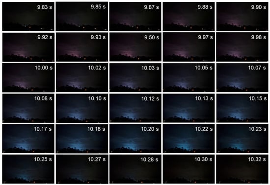 The camera recorded on 17 April 2023 from 06:34:09.6 UTC to 06:34:10.7 UTC. The camera, located at the coordinates 26.3419° N and 81.8013° W, operated at a frame rate of 59.96 fps, resulting in a frame-to-frame interval of 16.67 ms. A total of 61 frames are recorded, corresponding to approximately the duration of 1.02 s. Figure 7 displays frames from 06:34:09.833 UTC to 06:34:10.300 UTC, with the luminosity event lasting for 450 ms, spanning from 9.85 s to 10.30 s. Pinkish luminosity appears at 9.85 s, persists for 117 ms, and then transitions to purple at 9.97 s, where it continues for 100 m. The final shift from purple to blue occurs at 10.07 s and maintains the same color for a duration of 183 ms. Figure 8 illustrates lightning events reported by GLM on 17 April 2023, with the timeframe ranging from 04:34:09.750 UTC to 04:34:10.750 UTC, covering the observation time of the frames. The map displays coordinates of 26.05° N–26.35° N and 81.5° W–82.05° W, with a color scale ranging from red to violet in a 0.125 s time window. As shown in Figure 8, the discharge is positioned along a straight line, predominantly located beneath the edge of a dense cloud. The first detected event in the map is at 9.850 s.