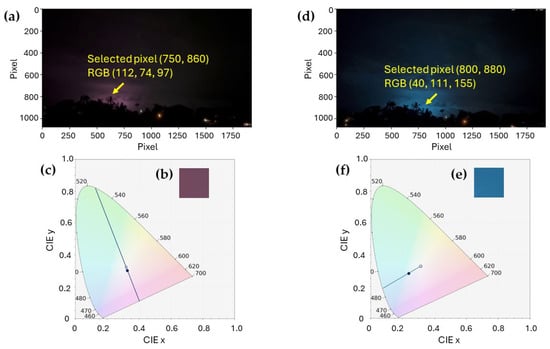 For the analysis of chromaticity, two frames—one displaying pinkish/violet luminosity and another with emerald-green/blueish luminosity—are selected as reference frames. A pixel is selected at bright luminosity, most emphasizing these color spectra. Figure 11a represents a reference frame showing the luminosity with pinkish/violet light (at 9.950 s), as shown in Figure 7. The selected pixel coordinates (750, 860) have an RGB value of (112, 74, 97). Figure 11b illustrates a zoomed-in view of this selected pixel. Figure 11c illustrates the CIE 1931 chromaticity diagram. The CIE wavelength of the emitted light from the selected pixel on the image is 440 nm. Figure 11d displays a reference frame with emerald-green/blueish light (at 10.22 s), as shown in Figure 7. The selected pixel coordinates are (800, 880), with an RGB value of (40, 111, 155). Figure 11e illustrates a zoomed-in view of this selected pixel. Figure 11f illustrates the CIE 1931 chromaticity diagram. The CIE wavelength of the emitted light from the selected pixel on the image is 490 nm. The pinkish/violet pixel, with a wavelength of 420 nm, is very short and close to UV light, influenced by nitrogen (N2) gas in the atmosphere [26]. On the other hand, the second frame with blueish/green luminous pixels has a wavelength of 490 nm, corresponding to part of the green spectrum produced by electrons colliding with oxygen atoms (O) [33], as indicated in the Introduction section. When the frame shows pinkish/violet luminosity, it indicates that electrons with high energy are colliding with atoms and molecules. These collisions cause the electrons in the atoms and molecules to move to higher energy levels, resulting in the emission of light with shorter wavelengths, which corresponds to the pinkish/violet color [34]. On the other hand, when the frame shows emerald-green/blueish luminosity, it suggests that the energy of the electrons involved in the collisions is lower compared to the energy levels associated with the pinkish/violet luminosity. The concentration of molecules is expected to remain consistent over the short timescale of a lightning discharge (tens of milliseconds). Changes in luminous color during a lightning discharge can be caused by momentary shifts in the discharge’s behavior while interacting with atoms and molecules in cloud particles or water droplets. Additionally, abrupt changes in the concentration of these atoms and molecules, influenced by factors such as wind or humidity, can also affect the color of the emitted light.
