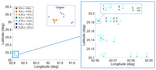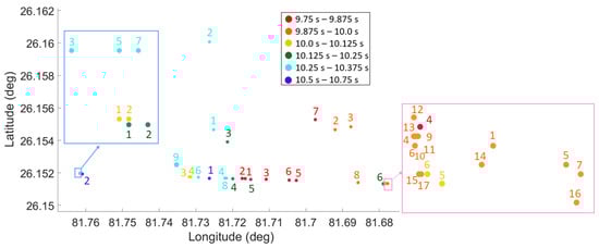 Zoomed-in view of Figure 8, coordinates of 26.15° N–26.162° N and 81.68° W–81.76° W, with a color scale ranging from red to violet within a 0.125 s time window. The dots within the blue box and the pink box are magnified, respectively. The number of each dot represents its chronological order of occurrence.