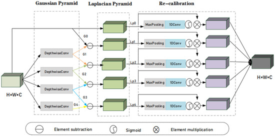 There are three components: a Gaussian pyramid, a Laplacian pyramid, and a frequency attention module. The input feature map is transformed into a Laplacian pyramid using the difference of Gaussian (DoG): diverse Gaussian kernels and variances are incorporated into Gaussian functions to generate two-dimensional Gaussian kernels and further form a Gaussian pyramid, and the Laplacian pyramid is generated by subtracting between different levels of the Gaussian pyramid. The computational formulas for both the Gaussian and Laplacian pyramids are, respectively, presented in Equations (