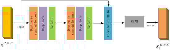 are inputted into a residual block comprising a depthwise separable convolution layer, dropblock layer, BN layer, and ReLU activation function to obtain the output