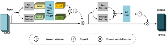 In the channel attention mechanism, is fed into average pooling and max pooling to capture the global information of each channel. Then, the channel attention weight vector is obtained by shared-weight one-dimensional convolution and sigmoid function and multiplied with to obtain the output of the channel attention block .