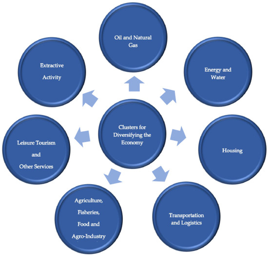 Seeking this maturity, seven priority clusters were defined in 2004 and rectified by [8], as shown in Figure 1. The seven clusters for diversifying the economy are Agriculture, Fisheries, Food, and Agro-Industry; Energy and Water; Extractive Activity; Housing; Leisure, Tourism, and Other Services; Oil and Natural Gas; and Transportation and Logistics. The clusters divided themselves into targeted programs (including the adoption of philosophy and the full range of Lean tools), integrating projects of investment and, for their part, speeding up economic diversification [12].