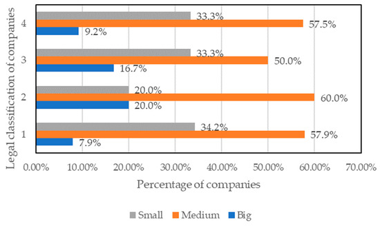 Classification of companies according to size (%) (1—Private, 2—State, 3—Mixed, 4—Total).