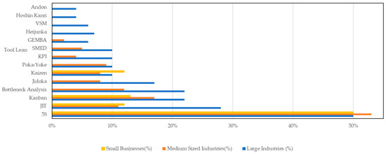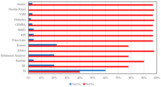 Therefore, the objective of this work was to analyse the maturity level of industries in Luanda regarding the Lean philosophy practices and tools; analysing whether the industries knew the 5S, Just-In-Time (JIT), Kanban, Bottleneck Analysis, Jidoka, Kaizen, Poka-Yoke, KPI, SMED, Gemba, Heijunka, Value Stream Mapping (VSM), Hoshin Kanri and Andon; whether such tools were used. In addition, an analysis was conducted of the implementation of the five Lean principles established by [13]: (a) Value; (b) Value Chain; (c) Continuous Flow; (d) Pull system; and (e) Pursuit of perfection [13]. This work also aims to propose practical implementation actions to contribute to the continuous improvement in companies’ productivity. The hypothesis raised states that the production practices implemented by the companies operating in the Angolan industrial fabric show an adequate level of maturity in accordance with the requirements of the Lean philosophy (LP) in view of the current challenges of this market.