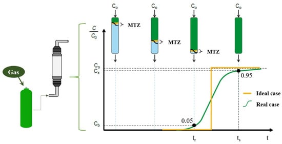 Figure 1 shows a schematic of the fixed-bed adsorption process, where the adsorbate (gas), with initial concentration C0, transfers from the solution to the adsorbent surface. Initially, the concentration at the outlet is zero, but it gradually increases as the sites become saturated. The breakthrough curve, which describes this process, is obtained by relating the concentration of the component at the inlet and outlet of the column (C/C0) over time. The region of highest component removal, known as the mass transfer zone (MTZ), can vary with temperature, component concentration, flow rate, and mass transfer rates [18,19].