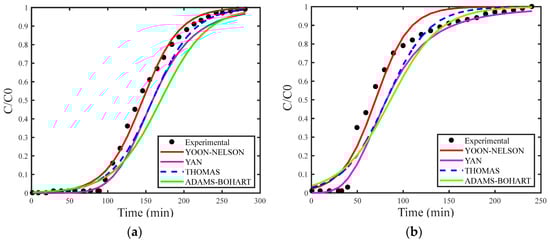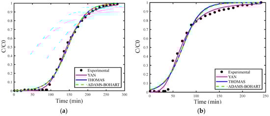 Figure 2a,b presents breakthrough curves simulated using the estimation of maximum adsorption capacity for the Thomas (qs), Adams–Bohart (N0) and Yan (qs). Figure 3a,b displays the simulated breakthrough curves with deterministic qs and N0 obtained from the study by [29], both including the corresponding experimental data curve for the Thomas, Yoon–Nelson, Adams–Bohart, and Yan models.