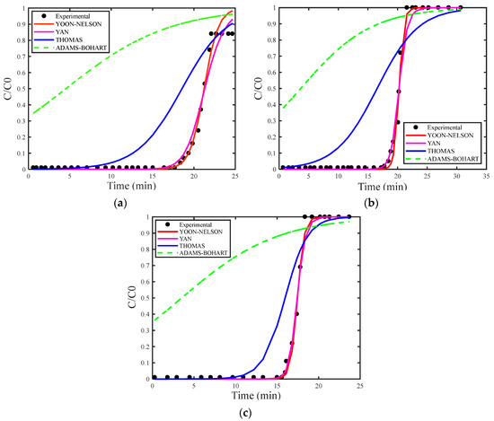 Figure 4a–c show the breakthrough curves simulated using the estimated maximum adsorption capacity for the Thomas (qs), Adams–Bohart (N0) and Yan (qs) models. Figure 5a–c present the breakthrough curves estimated with the deterministic values of qs and N0 obtained from the study by [30], covering the Thomas, Yoon–Nelson, Adams–Bohart, and Yan models, including the curve corresponding to the experimental data for proper comparison.