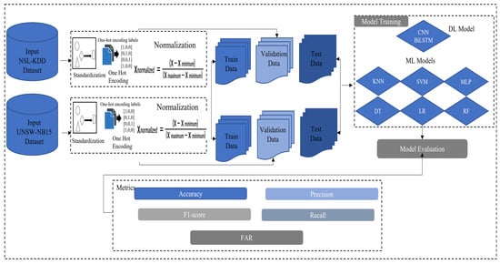 Figure 1 depicts the system overview of the methodologies employed for the network-based IDS. Two benchmark datasets, NSL-KDD and UNSW-NB15, were used to train and test the deep learning and machine learning models for intrusion detection.