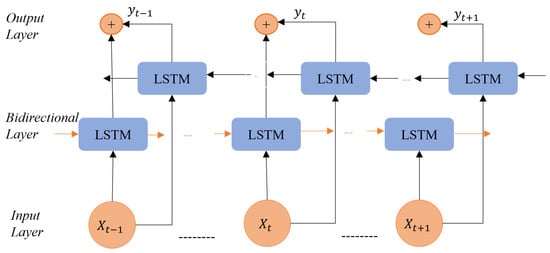 Bi-LSTM layers contain two units, with identical input and output in the hidden layers, to enable learning from both forward and backward time-series data. Time-series data are handled by one unit in the forward direction and the other in the backward direction. This arrangement is thought to provide future data to the layers for improving training time with stronger feature learning, leading to improved precision for multi-dimensional time-series data. In Figure 2, an example of a bidirectional LSTM cell structure is given with input data , , , , alternately processed through a forward hidden layer , , and backward hidden layer , , to create , , . A better prediction outcome can be obtained by optimizing the Bi-LSTM’s feature information extraction through the forward and backward layers. The kernel size of the model doubles with each iteration according to the architecture of the BiLSTM architecture. An LSTM network with the addition of forward and backward layers forms a Bi-LSTM network.