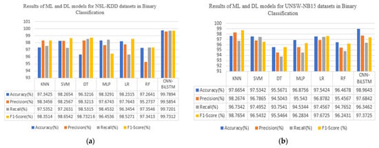 Results for all binary classification models: (a) binary classification on NSL-KDD; (b) binary classification on UNSW-NB15.