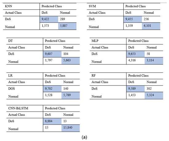 Accuracy represents the proportion of network activities that are correctly classified, including both DoS attacks and normal traffic. Equation (2) defines its calculation. Equation (3) represents precision as the proportion of detected DoS attacks that are correctly classified. Recall measures the proportion of actual DoS attacks that are corrected and detected, as indicated by Equation (4). The F1-score is a thorough assessment metric. Its definition is given in Equation (5) as the weighted harmonic average of precision and recall. The percentage by which normal traffic is regarded as DoS attacks is known as the false alarm rate (FAR). Equation (6) illustrates how this can be quantified.