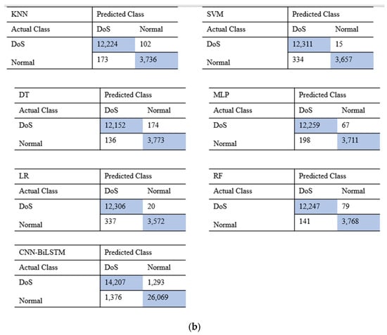 To validate the effectiveness of the intrusion detection system, we compared the deep learning model CNN-BiLSTM with the machine learning models KNN, SVM, DT, MLP, LR, and RF. The results of the NSL-KDD and UNSW-NB15 datasets in terms of binary classification are shown in Figure 4. The CNN-BiLSTM model demonstrates notable accuracy, precision, recall, and F1-score, achieving scores of 99.78%, 99.58%, 99.72%, and 99.73% for the NSL-KDD dataset and 98.96%, 97.68%, 96.34%, and 97.37% for the UNSW-NB15 dataset, respectively. Figure 5 shows the results for both datasets in multiclass classification. Here, both the deep learning and machine learning models are trained to detect a specific attack, which is the DoS attack. By combining the performance of different classifications on the two datasets, we can achieve good results in terms of DoS attack detection, accompanied by a low FAR rate. As shown in Table 5 and Table 6, the deep learning model achieves the highest accuracy compared with the machine learning models, with an accuracy of 99.89% on the NSL-KDD dataset and 98.95% on the UNSW-NB15 dataset. The results in Table 5 and Table 6 are based on the average performance over five experimental runs for each model. Lower values of the standard deviation imply more stable results across several runs, and they show how consistently the model performs. Moreover, it can be seen that the deep learning model performs well in terms of the FAR on both datasets, indicating very accurate predictions. Amongst the machine learning models, it can be observed that the SVM model outperforms the machine learning models, with an accuracy of 98.65% on the NSL-KDD dataset. It effectively distinguishes between normal network and attack instances, resulting in a low FAR. SVM’s ability to handle complex decision boundaries makes it suitable for intricate intrusion detection scenarios. On the other hand, KNN achieved the lowest accuracy in comparison with other machine learning models on the NSL-KDD dataset. It achieved an accuracy of 97.42% and a balanced precision–recall trade-off, indicating its effectiveness in correctly classifying both normal and attack instances. However, it has a relatively false alarm rate compared to the other models, and this is because it relies on a simple majority voting scheme among its nearest neighbors. Hence, in scenarios where the nearest neighbors include noisy or misclassified instances, KNN may produce false alarms when classifying test instances, especially in regions of the feature space where the density of training instances is sparse or heterogeneous. KNN outperforms the other machine learning models, with an accuracy of 97.78% on the UNSW-NB15 dataset.
