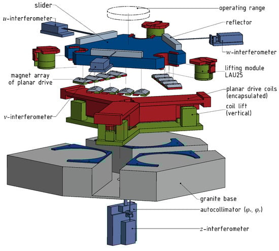 In principle, the planar direct drive architecture is well suited to be enhanced by vertical actuation because of the planar arrangement of the drive components. Coils and magnets each are located in horizontal planes so that the slider is free to move vertically. Moreover, compared to a stacked axis arrangement the vertical actuation here can be implemented directly between the stator and the moving part. In this way, it is possible to maintain the advantages of the direct drive principle by continuing to have all actuation forces acting directly on the same body. This body is the so-called slider, and its movement is controlled in six DOFs. The displacements in x, y, z are available for large-scale movements, whereas the rotational DOFs are regulated to zero.