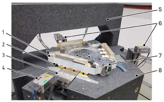 Photograph of NPS6D200 long range nanopositioning stage. Components: 1—slider with reflectors. 2—magnets of the planar direct drive (moving with the slider). 3—coils of the planar direct drive (encapsulated) 4—laser interferometer. 5—granite portal with probe mount interface. 6—laser interferometer. 7—lifting module LAU25. 8—granite base.