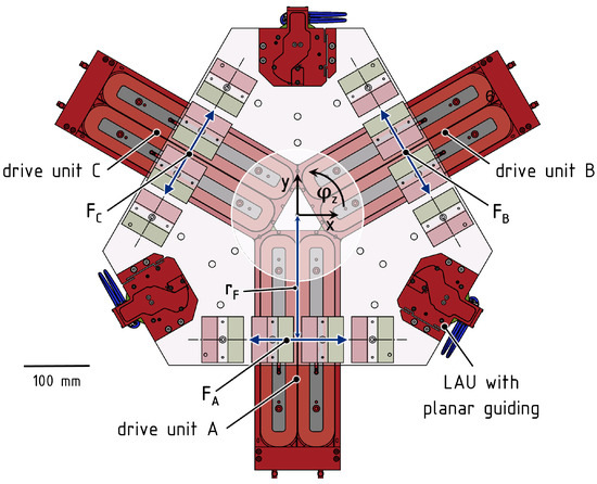 The integrated direct drive to control the planar motion is formed by a 120° arrangement of three linear actuators (A, B, C), each consisting of stationary flat coils and a magnet array fixed to the slider. This is illustrated in Figure 3. At each of the actuators, the force is generated as a Lorentz force between the coils and magnets, and the phase currents in the two coils are subject to a position-dependent commutation law to have the resulting force mainly horizontal and to minimize the parasitic vertical force components. The three forces of and C combine to the resulting driving forces in the plane () and the driving torque to control , respectively. According to the 120° arrangement, this transformation reads as per