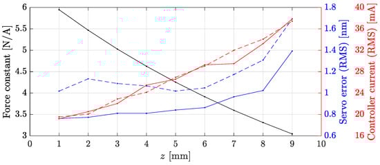 The slider’s planar motion is guided by three planar air-bearing pads, each at the bottom of a lifting module. The reflectors are bonded directly to the slider and both are made of quartz glass to minimize susceptibility to thermal disturbances. For the same reason, the drive coils are encapsulated in a stainless steel housing with flat tempering channels on top and beneath the coils. Hence, this coil housing allows precise control of the temperature of the coil assemblies via a water cycle and a thermostat. Table 3 contains the main characteristics of the planar drive in the nominal state at the bottom of the 25 vertical working range. When the slider is lifted, the air gap between the coils and magnets increases beyond the nominal state, and the conditions for generating the planar drive forces change. The main effect here is a decrease in the efficiency of force generation, expressed by a decrease in the force constant of the actuators. Based on prior FEM simulations, a drop of approximately 50% was expected for a vertical displacement up to 10 . In view of this and with the desired vertical displacement of up to 25 , a coil lift functionality was developed and integrated into the stage design. The coil lift system displaces the star-shaped common base of the drive coil assemblies according to the slider’s z position so that the air gap between the coils and magnets remains close to the nominal level and the conditions for the generation of the planar driving forces do not change significantly with the sliders elevation. Thereby, the tracking motion of the coil lift system does not have to be highly precise because the air gap tolerates minor height variations. The primary design challenge here is ensure adequate lateral stiffness to accomodate the reaction forces at the coils. This is solved by means of an aerostatic guiding for the moving part which was developed together with AeroLas GmbH. With the whole system in operation, the drop in force constant was investigated in situ, and the results are contained in Figure 4 together with the corresponding increase in the coil currents and the closed loop servo error. The results confirm the expectations and indicate that the RMS servo error is not significantly affected by a levitation level of up to 6 . At this levitation height, the remaining force constant of the planar drive is approximately of the nominal value. However, we conclude from these investigations that up to a vertical displacement of approximately 6 , the planar drive system does not experience substantial loss in performance and can be utilized even without repositioning the coils.