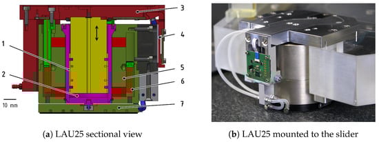 Lifting and actuation module LAU25. 1—Air bushing as vertical guiding. 2—Pressure chamber of pneumatic weight force compensation. 3—Moving part (mounted to the slider). 4—Encoder measurement system. 5—Voice coil actuator, iron core. 6—Voice coil actuator, coil part (moving). 7—planar air bearing.