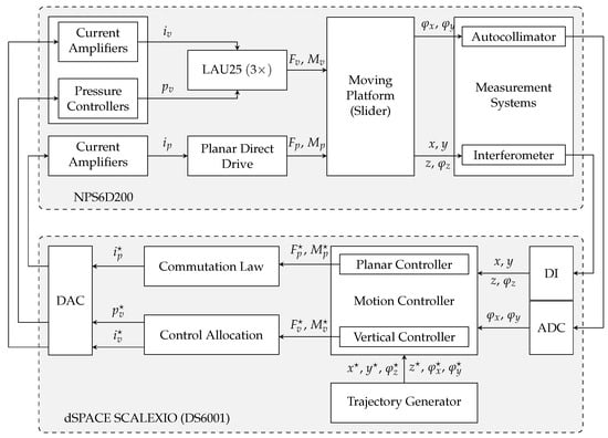The standard structure of the control system is shown in Figure 6. The core of the control hardware is a dSpace Scalexio rapid control prototyping system [41] where the control algorithm runs as a real-time task with sample frequency. The controller task collects the 6D feedback signals via analog and digital inputs and calculates new target values for the different actuators based on the developed control law. The command values are the current and pneumatic pressure setpoints for the previously described planar and vertical actuators. An intermediate layer of control hardware, namely linear analog current amplifiers and high-precision pressure controllers, converts these command values into actual physical quantities—coil currents and pneumatic pressures—that are applied to the actuators in the motion stage.