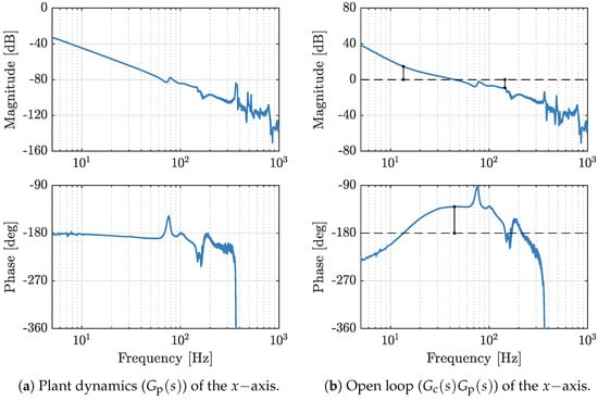 Figure 8 shows the measured bode response of a single axis together with the open loop frequency response for the x axis. The loop shape (Figure 8b) features remarkably robust stability margins, as was expected from the stage design. Although not shown here, the tuning procedure for the remaining motion axes is devised in an analogous manner using the measured frequency response, see Table 6.