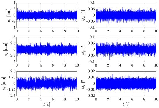The first important characteristic is the remaining servo error at a constant setpoint. Figure 9 shows the time signals of the six DOFs measured with the internal feedback system with the stage fully activated and at a constant setpoint in the center of the travel range. At this point, the conceptual benefits mentioned above pay off, and a remaining RMS servo error below 1 nm for x, y, and z is achieved with the developed controller.