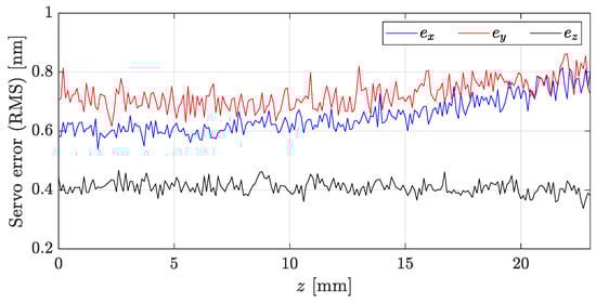 When the slider changes its position within the planar and vertical travel range, the mechanical conditions of the force transfer change, and accordingly, a change in control behavior is expected. In corresponding investigations, we find that the servo errors vary slightly within the lateral travel range of Ø, but nonetheless, they remain in the range below (RMS), as depicted in Figure 10. Also, concerning the vertical slider position, only a minor servo error variation below 1 nm is observed, as shown in Figure 11. This performance in static setpoint operation opens the path for deterministic motion at the nanometer level, which is demonstrated by the illustrative staircase exercise shown in Figure 12.