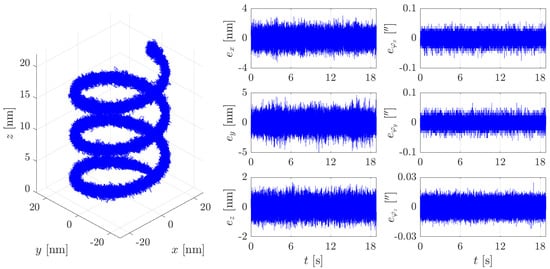 In a second set of experiments the tracking performance was evaluated by means of 3D positioning exercises that require simultaneous and synchronized movements in the different axes. Such exercises reveal remaining parasitic cross-coupling effects between the DOFs and are well suited as a performance test for complex 3D motion paths. To analyze the occurence and extend of these effects we execute a stage movement along a helix with varying dimensions from the nanometer (Ø40 × 20 ) to the millimeter (Ø40 × 5 ) range. The stage velocity is adapted accordingly and ranges from 7 up to 7 . Together with the tracking errors, the control effort and the power loss in the actuators are analyzed because of their great importance for any future application scenario. Exemplarily, Figure 13 shows the result of positioning a helix with Ø and a path velocity of while Table 7 summarizes the achieved tracking errors and current consumptions connected to the different helix positioning exercises. As can be seen from the table, we obtained servo errors in the low nanometer range together with currents in the range of only milliamperes. From that we conclude that only very little parasitic effects occur as a benefit of the stage design, the weight force compensation, and the consequent application of aerostatic guiding. Furthermore, the developed controller can handle the remaining disturbances quite well, which is a consequence of the its design and the achieved stability margins, as given in Table 6. For a more detailed view into the controller design towards decoupling and disturbance rejection the reader may refer to [47].