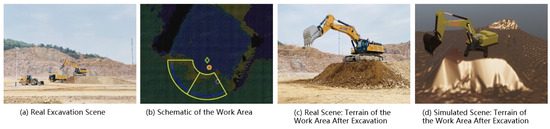 To simulate actual operations, radar devices were installed on both sides of the excavator’s cabin and boom to collect real-time data about the surrounding environment and terrain. The excavator’s LiDAR is the Ouster OS1. The Ouster OS1 is manufactured by Ouster, Inc., headquartered in San Francisco, CA, USA. This is a high-performance LiDAR with a detection range of up to 100 m and an angular sampling accuracy of vertically and horizontally. The excavator’s four joint angles are fitted with IMU SYD T500 sensors. The manufacturer of the IMU SYD T500 sensors is SYD Dynamics, based in Odense, Southern Denmark. This is an integrated inertial measurement unit that incorporates multiple sensors, capable of outputting measurements from a 3-axis gyroscope and a 3-axis accelerometer with a timestamp resolution of less than 1 μs. During operations, these data were stored at a frequency of 50 Hz in Rosbag packages. The dataset includes the angular velocity of each joint of the excavator, joint force, piston rod speed, volume of soil excavated, ground support force, and LIDAR point clouds. The operator’s excavation trajectory, followed during the operation, was transmitted to a simulation platform (Unity) via the UDP protocol in Matlab 2023a to acquire data on the excavation process in a simulated environment. Figure 2c illustrates the terrain of the work area after the completion of the excavation in the real scenario. Figure 2d displays the terrain of the work area after the excavation in the simulated scenario, which is essentially consistent with the terrain in the real scenario.