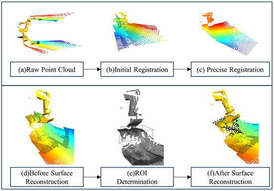 In our study, the region of interest (ROI) is delineated by an axis-aligned bounding box to focus on terrain changes in front of the excavator bucket. The ROI is defined by coordinates and , significantly reducing data processing volume and increasing efficiency.