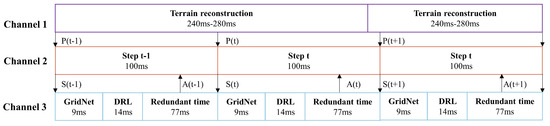 Channel 3: The state S(t) is relayed to the DRL model operation channel where it first undergoes processing by the GridNet, taking 9 ms, followed by decision making through the DRL model, which takes 14 ms. Ultimately, the DRL model outputs an action A(t), a vector containing increments for four joint angles, to guide the excavator’s subsequent movement.