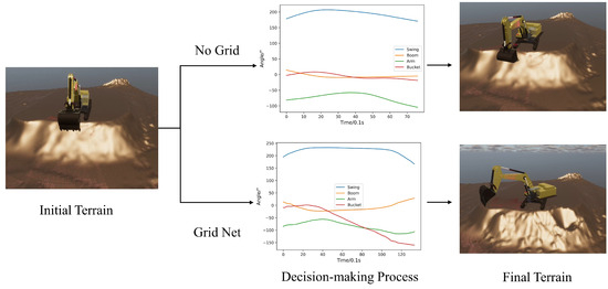 The complete operational results of the E-GTN are depicted in Figure 6. Within the simulated environment, the excavator’s bucket has a capacity of 4.5 cubic meters. Under the implementation of our method, coupled with the GridNet’s terrain feature extraction, the system achieved an average excavation volume of 3.7 cubic meters per scoop with a standard deviation of 0.27 cubic meters. In contrast, without the feature extraction, the average excavation volume dropped significantly to 0.45 cubic meters per scoop, with a standard deviation of 0.46 cubic meters. These findings underscore the efficacy of integrating GridNet in enhancing the precision of the excavation process, optimizing the excavator’s operational capacity, and highlighting the importance of terrain feature extraction in the decision-making process.