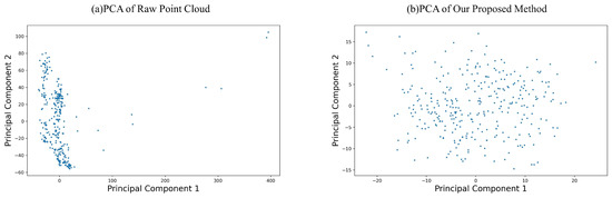 Conversely, Figure 8a illustrates the PCA results of the raw grid data. Here, the first two principal components have an explained variance ratio of 0.25 and 0.19, which together explain less than 50% of the total variance. The scatter plot reveals a concentrated distribution of data points, indicating a strong clustering tendency. This concentration implies that the raw data may inherently contain less complexity or fewer distinct patterns before the application of feature extraction techniques.