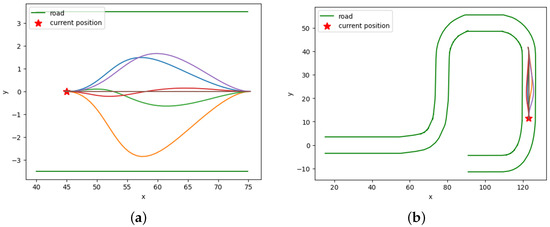 - Werling, M.; Ziegler, J.; Kammel, S.; Thrun, S. Optimal Trajectory Generation for Dynamic Street Scenarios in a Frenet Frame. In Proceedings of the 2010 IEEE International Conference on Robotics and Automation, Anchorage, AK, USA, 3–7 May 2010; IEEE: Piscataway, NJ, USA, 2010; pp. 987–993. [Google Scholar]