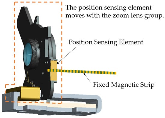 The high-precision positioning control system ensures that the zoom lens group accurately moves to the designated position, achieving precise focal length changes during rapid zooming. As shown in Figure 3, this system mainly comprises a position-sensing element, a magnetic strip, and a control circuit. The position-sensing element is fixed to the zoom lens group and these move together, while the magnetic strip is fixed inside the lens and remains stationary. During zooming, the energized coil drives the zoom lens group and the position-sensing element to move relative to the fixed magnetic strip. The motion position-sensing element records the periodic changes in the magnetic field of the fixed magnetic strip, thereby providing real-time feedback on the zoom lens group’s movement. Through the feedback control circuit, the system achieves real-time closed-loop control, ensuring the precise positioning of the zoom lens group. The high-precision positioning control system must meet the requirements for the axial positioning accuracy of the lens group to ensure that positioning errors do not affect the image quality.